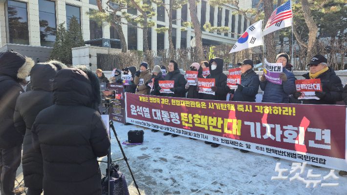 이날 열린 윤석열 탄핵 반대 기자회견에서 국민주권행동 홍영태 공동상임대표는 헌재 재판관들의 이름을 직접 거론하며 "재판관 자리에 앉을 사람이 아닌데 자기들이 원하는 나라를 만들려고 하고 있다"며 "엘살바도르에 흉악범만 관리하는 수용소가 있는데 나는 문형배(헌재소장 권한대행)가 엘살바도르에 가야 한다고 생각한다"고 주장했다.