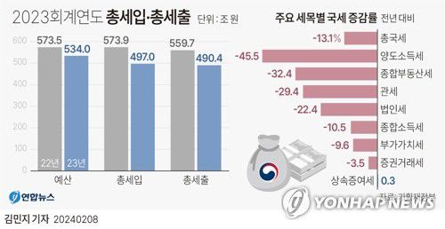 앞서 기재부는 세수 재추계를 통해 2024년도 국세 수입이 337조7천억원으로 세입예산(367조3천억)보다 29조6천억원(8.1%) 부족할 것으로 예상했다.