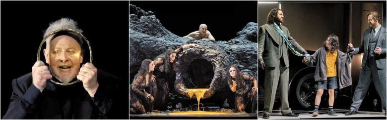세계 각지에서 공연한 오페라 ‘라인의 황금’ 속 장면들. 연출가들은 바그너의 원작 오페라 속 황금과 황금으로 만든 반지를 가상 화폐(왼쪽), 액체(가운데), 어린아이(오른쪽) 등 시대상을 반영한 다양한 모습으로 변형해서 그려냈다./파리 국립 오페라 극장, 로열 오페라 하우스, 바이로이트 축제 극장 |