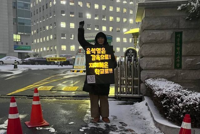 ▲ A학교 성폭력 공익제보자인 지혜복 교사가 서울특별시교육청 앞에서 부당해임 철회 요구 1인 시위를 하고 있다. ⓒ3.8여성파업준비위원회 |