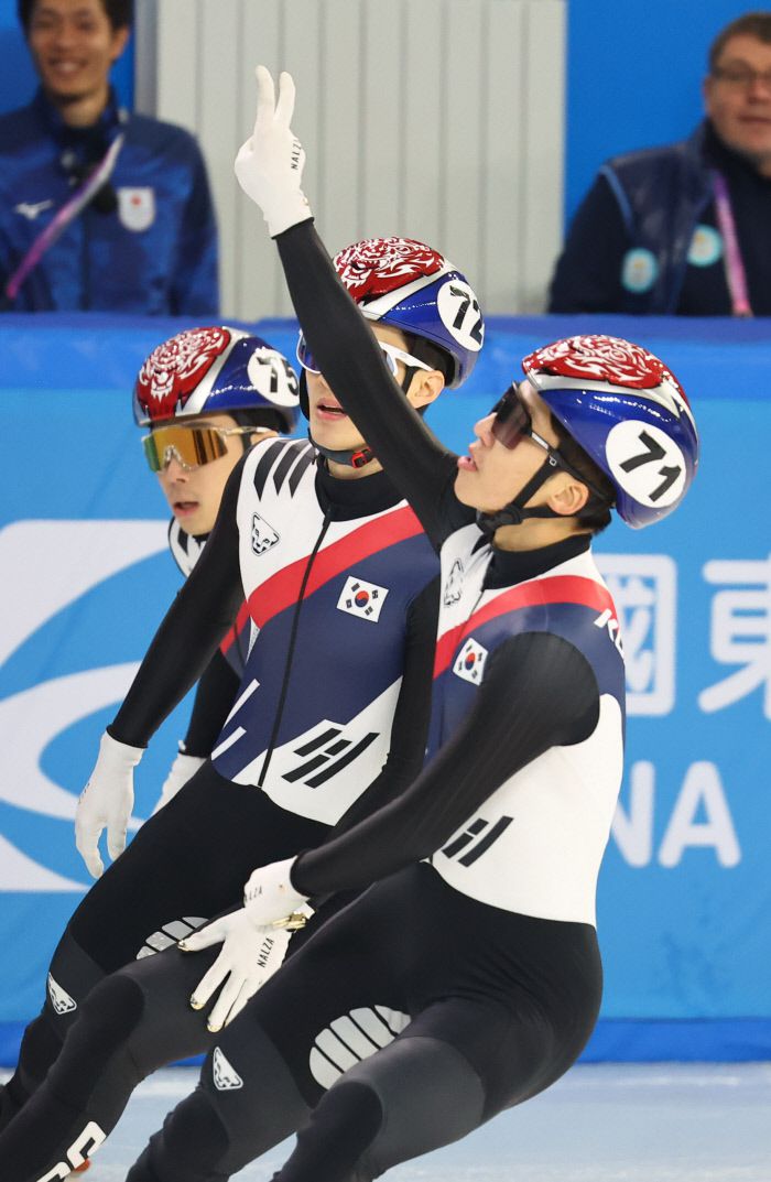 한국 쇼트트랙 대표팀이 2000m 혼성 계주에서 극적으로 금메달을 목에 걸었다. 마지막 주자 박지원은 오른손으로 ‘1’을 펴 보이며 여유롭게 피니시 라인을 밟았다.