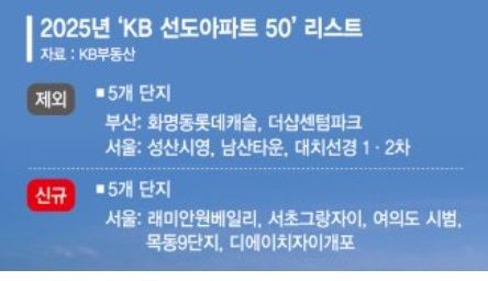KB부동산은 최근 2025년 선도 아파트 50 리스트를 공개했다. 5개 단지가 탈락하고 새롭게 편입된 가운데 지방은 아예 자취를 감춘 것이 특징이다. 한 전문가는 “강남권 신축과 유망 재건축 단지가 부상한 것이 특징”이라며 “규제가 빚어낸 역설로 볼 수 있다”고 말했다.