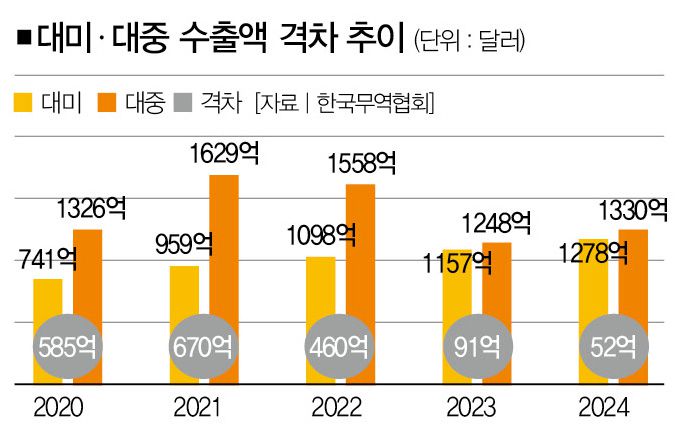 한국 입장에선 미국과 중국 어느 한쪽에 집중한 수출 전략을 펴기도 어렵다. 지난해 한국의 대미 무역흑자는 557억 달러로 세계 8위다. 게다가 최근 대미對美 수출 비중은 늘어나고 대중對中 수출 비중은 줄어드는 추세다. 그만큼 트럼프 2기 정부의 관세 공격 타깃 등 더 큰 보상을 요구할 가능성이 높다는 우려가 제기된다.