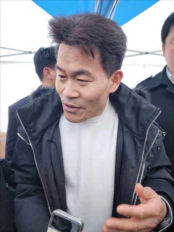 공무원 시험 ‘한국사 일타강사’ 전한길씨가 8일  대구 동구 신암동 동대구역 광장에서 열린 윤석열 대통령 탄핵 반대 집회에 참석한 뒤 서울신문 취재진과 인터뷰를 하고 있다. 2025. 2. 8. 대구 민경석 기자