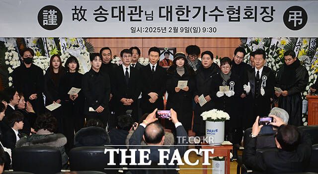 [더팩트ㅣ서예원 기자] 고 송대관의 영결식이 9일 오전 서울 종로구 서울대학교병원 장례식장에서 엄수된 가운데 태진아, 설운도를 비롯한 가수들이 조가 '해뜰날'을 부르고 있다.