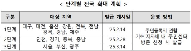 1단계는 2월 14일부터 진행된다. 대상은 시범 발급 기초 지자체가 속한 광역 지자체 중심으로 선정했다. 대구·대전·울산·강원·전남·전북·경남·경북·제주 등이다. 고양시가 속한 경기도는 인구 규모 등을 고려해 1단계에서 제외됐다.