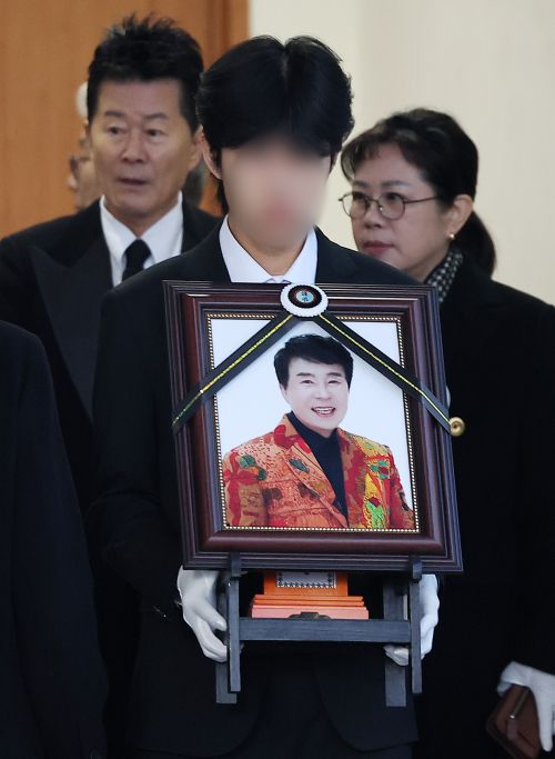 가수 송대관의 유족이 9일 서울 종로구 서울대병원 장례식장에서 영정을 들고 이동하고 있다. 뉴스1.
