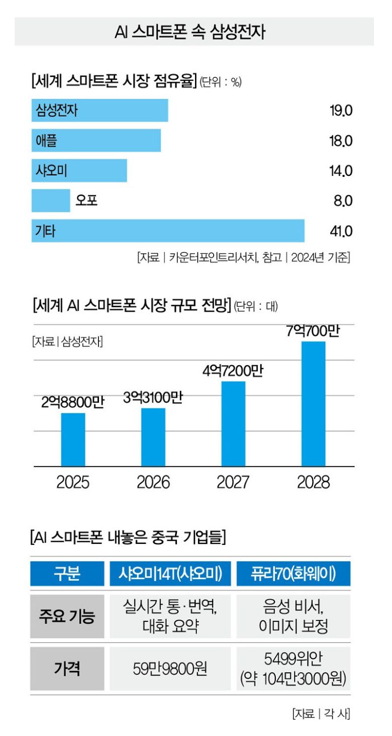중국 기업들도 AI 스마트폰을 선보이며 추격에 나서고 있다. 샤오미가 지난해 9월 출시한 '샤오미 14T'는 실시간 통‧번역, 대화 요약 등의 AI 기능을 담고 있다. 그러면서도 가격은 59만9800원으로 삼성전자 스마트폰보다 절반가량 저렴하다. 화웨이도 4월에 음성 비서와 이미지 보정 등 AI 기능을 탑재한 '퓨라70'을 선보였다.