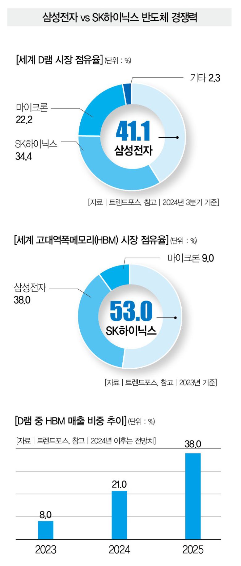 하지만 HBM 시장 점유율에선 2023년 기준 SK하이닉스가 53.0%를 차지해 삼성전자(38.0%)를 제친 지 오래다.[※참고: D램은 메모리 반도체의 일종으로 데이터를 임시 저장하는 역할을 맡는다. HBM은 D램을 여러개 쌓아 올려 만든 메모리 반도체로, D램보다 더 높은 대역폭을 제공한다. HBM이 D램보다 더 각광 받는 이유다.]