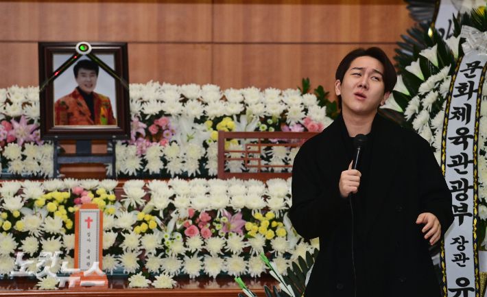 9일 서울 종로구 서울대병원 장례식장에서 열린 가수 송대관의 영결식에서 김수찬이 고인의 성대모사를 하고 있다. 사진공동취재단 |