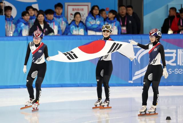 최민정(왼쪽부터) 김길리 이소연이 8일 중국 하얼빈 헤이룽장 빙상훈련센터에서 열린 2025 하얼빈 동계아시안게임 쇼트트랙 여자 500m 결선에서 금은동메달을 획득한 후 태극기를 들고 기뻐하고 있다. 하얼빈=뉴시스 |