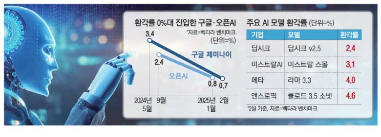 구글과 오픈AI가 올해 내놓은 최신 인공지능(AI) 모델이 역대 최초로 환각률 0%대를 기록했다. 환각은 AI 모델이 부정확한 답을 생성하는 것을 의미하는데, 이제는 AI가 질문 100개 중 99개 이상에서 옳은 답을 제공하는 수준으로 발전한 것이다.