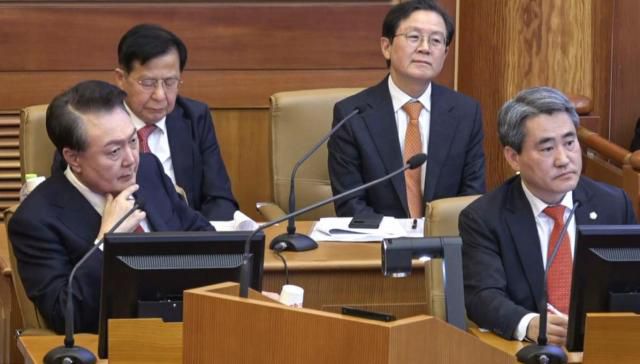윤석열 대통령(앞줄 왼쪽)이 6일 서울 종로구 헌법재판소에서 열린 윤 대통령 탄핵 심판 6차 변론에서 증인으로 출석한 곽종근 전 육군 특수전사령관의 피청구인 측 답변을 듣다 손으로 변호인을 부르고 있다. [사진=연합뉴스] |