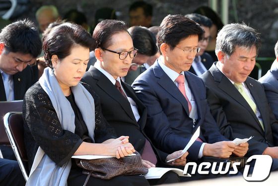 이명박 전 대통령과 김윤옥 여사, 김문수 경기도지사가 3일 오후 경기도 동두천시 광암동 두레마을 숲속창의력학교에서 열린 준공식에 참석해 기도를 하고 있다. 2013.10.3/뉴스1 |