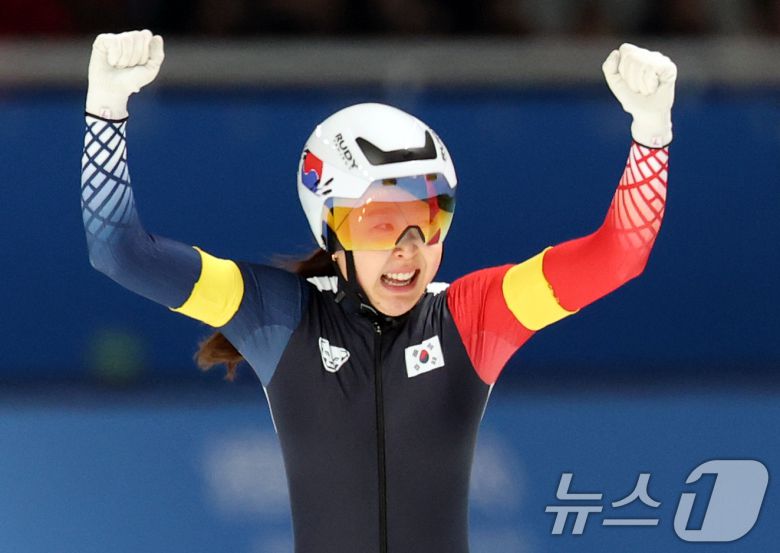 9일(현지시간) 중국 헤이룽장성 하얼빈 스피드 스케이트 오벌에서 열린 하얼빈 동계아시안게임 스피드 스케이팅 여자 팀스프린트에서 마지막 주자로 나선 김민선이 결승선을 통과하며 기뻐하고 있다. 김민지, 이나현, 김민선으로 구성된 대표팀은 이날 1분 28초 62로 금메달을 획득했다. 2025.2.9/뉴스1 ⓒ News1 이승배 기자