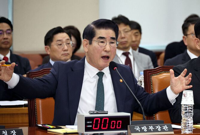 김용현 국방부 장관이 지난 11월 국회에서 열린 국회 국방위원회 전체회의에 출석해 윤석열 대통령의 골프장 이용 등에 대한 질문에 답변하고 있다. 윤운식 선임기자 yws@hani.co.kr