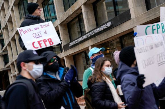일론 머스크의 정부효율부로부터 폐쇄 혹은 축소 대상으로 지목된 소비자금융보호국(CFPB) 직원들이 8일 워싱턴에서 이를 반대하는 항의 시위에 참가하고 있다. 로이터 연합뉴스
