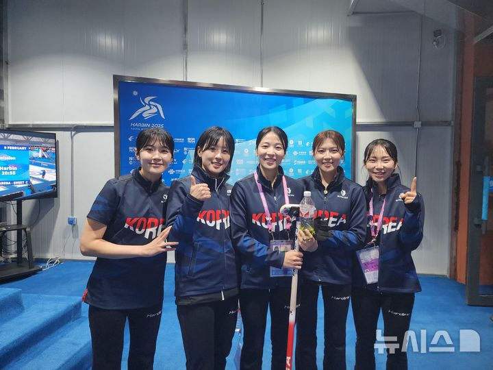 [하얼빈=뉴시스] 김희준 기자 = 한국 여자 컬링 대표팀이 9일 중국 하얼빈 핑팡 컬링 아레나에서 열린 2025 하얼빈 동계아시안게임 예선 라운드 로빈 2차전에서 일본을 6-4로 꺾은 뒤 믹스트존에서 포즈를 취하고 있다. 2025.02.09jinxijun@newsis.com