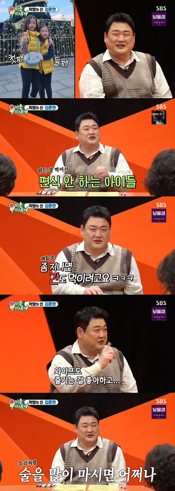 신동엽은 "딸이 둘 있는데 어렸을 때부터 엄마 아빠가 먹는 음식을 호기심 있게 바라보고 맛도 보고 하니까 이유식을 내장탕으로 했다는 이야기가 있을 정도"라고 해 웃음을 자아냈다. 이어 김준현의 두 딸의 모습이 공개됐다.
