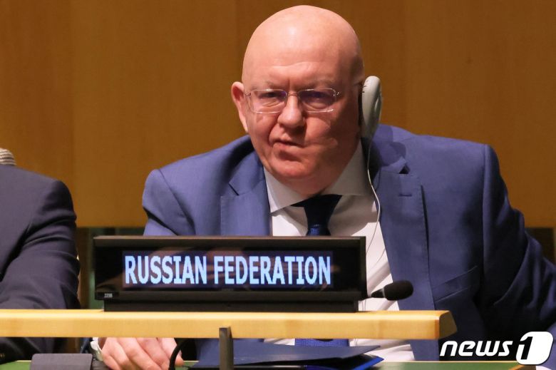 바실리 네벤자 유엔주재 러시아 대사가 14일(현지시간) 뉴욕 유엔본부에서 열린 러시아의 우크라이나 침공에 대한 배상 책임을 물리는 내용의 결의안을 표결하는 유엔 특별 총회서 세르히 키슬리차 유엔 주재 우크라이나 대사의 발언을 듣고 있다. ⓒ AFP=뉴스1 ⓒ News1 우동명 기자