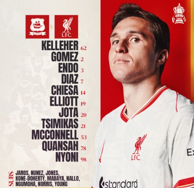 리버풀은 4-3-3 포메이션을 꺼냈다. 최전방에 루이스 디아즈, 디오구 조타, 페데리코 키에사가 나섰고 중원은 트레이 뇨니, 제임스 맥코넬, 하비 앨리엇이 구성했다. 포백은 콘스탄티노스 치미카스, 엔도 와타루, 자렐 콴사, 조 고메스가 호흡을 맞췄고 골문은 퀴빈 켈러허가 지켰다.