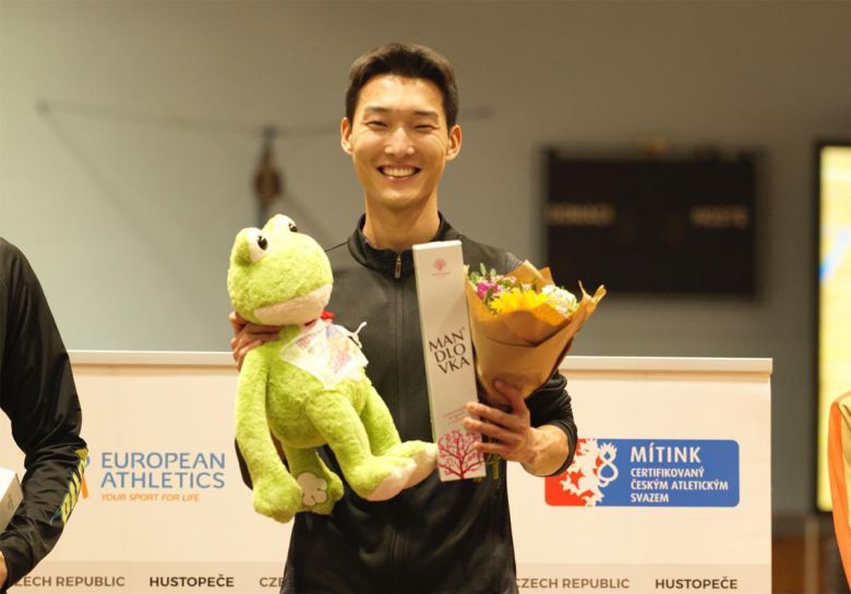 우상혁이 9일 체코 후스토페체에서 열린 2025 세계육상연맹 실내높이뛰기대회에서 우승한 뒤 꽃다발을 들고 환하게 웃고 있다. 대한육상연맹 제공