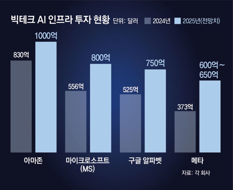 마이크로소프트(MS)와 구글도 AI 인프라에 공격적으로 투자한다는 계획이다. MS는 800억 달러를 AI 데이터센터와 컴퓨팅 클라우드 서비스 ‘애저’ 구축에 할당한다는 방침이고, 구글 알파벳은 올해 자본 지출 목표를 750억 달러로 밝혔다.