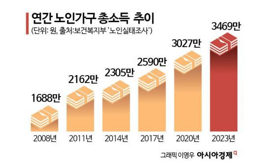 보건복지부가 발표한 '2023 노인실태조사'를 보면 노인들의 소득은 빠른 속도로 늘고 있다. 2023년 노인의 연간 가구소득은 3469만원이었다. 처음 조사를 실시했던 2008년(1688만원)과 비교해 두 배 넘게 뛰었다. 직전 조사인 2020년(3027만원)과 비해서도 400만원 이상 많아졌다. 교육 수준도 높아졌다. 전문대 이상 졸업한 노인은 2020년 5.9%에서 2023년 7.0%로 증가했다. 고등학교까지 공부한 비중도 같은 기간 28.4%에서 31.2%로 올랐다.
