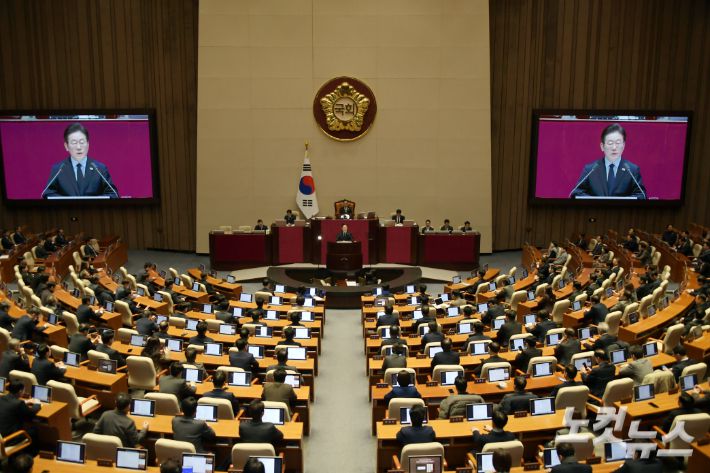 더불어민주당 이재명 대표가 10일 서울 여의도 국회에서 열린 제422회 국회(임시회) 제02차 본회의에서 교섭단체대표연설을 하고 있다. 윤창원 기자 |