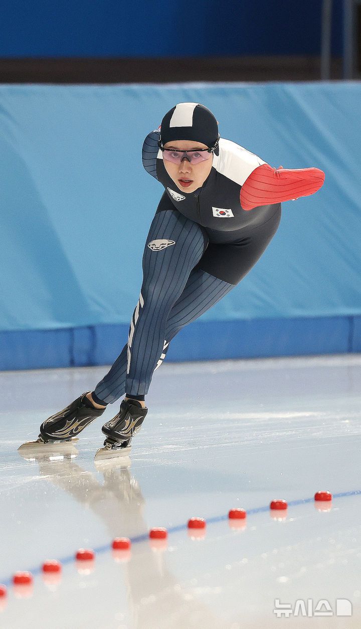 [하얼빈(중국)=뉴시스] 김선웅 기자 = 10일(현지 시간) 중국 하얼빈 헤이룽장 스피드스케이팅 오벌에서 열린 2025 하얼빈 동계아시안게임 스피드스케이팅 여자 500m 경기에서 대한민국 박지우가 질주하고 있다. 2025.02.10. mangusta@newsis.com