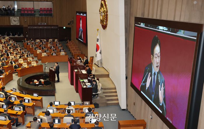 이재명 더불어민주당 대표가 10일 국회 본회의에서 교섭단체대표 연설을 하고 있다. 박민규 선임기자