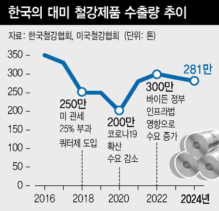 앞서 트럼프 1기(2017~2021) 때도 한국 철강 산업은 큰 위기를 맞은 바 있다. 당시에도 미 정부는 국가 안보를 내세워 철강 수입품에 25% 관세를 부과하겠다고 으름장을 놨다. 다만 협상을 거쳐 우리나라는 무관세 쿼터(직전 3년간 평균 수출량의 70%, 연간 263만톤)를 따냈으나, 대미 철강제품 수출량은 한해 만에 24.2%(330만→250만톤) 급감했다.