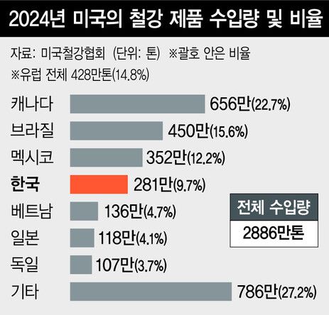 관세 전쟁의 범위가 넓어지자 한국도 직접적인 영향권에 놓이게 됐다. 현재 우리나라는 미국에 철강을 수출할 때 연간 263만톤까지 무관세를 적용받고 있다. 한국은 미국 철강 수입 시장에서 캐나다·브라질·멕시코에 이어 네번째로 철강제품을 많이 팔고 있다. 한국의 미 철강 수입 시장 점유율은 9.7%(2024년 기준·미 철강협회 기준)다.