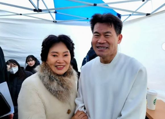 홍준표 부인, 전한길과 인증샷 - 한국사 ‘일타강사’ 전한길(오른쪽)씨가 지난 8일 대구에서 열린 윤석열 대통령 탄핵 반대 집회에서 홍준표 대구시장 부인 이순삼씨와 인증 사진을 찍고 있다. 이씨는 10일 자신의 소셜미디어(SNS)에 당시 집회에서 연사로 나선 전씨를 찍은 사진을 함께 올렸다. 이순삼씨 SNS 캡처 |