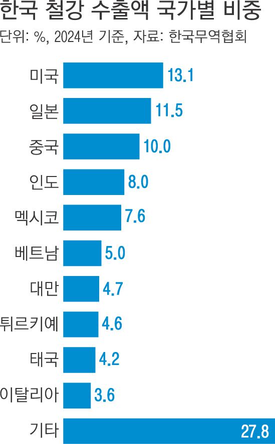 품목 관세에 추가로 보편 관세까지 부과되면 대미 철강 수출 물량은 더욱 감소할 것으로 전망된다. 또 중국산 저가 철강이 미국 대신 유럽, 아시아 등으로 쏟아져나오면 전 세계 철강 공급 과잉으로 한국 철강업체들도 수익성 악화를 피하기 어렵게 된다.