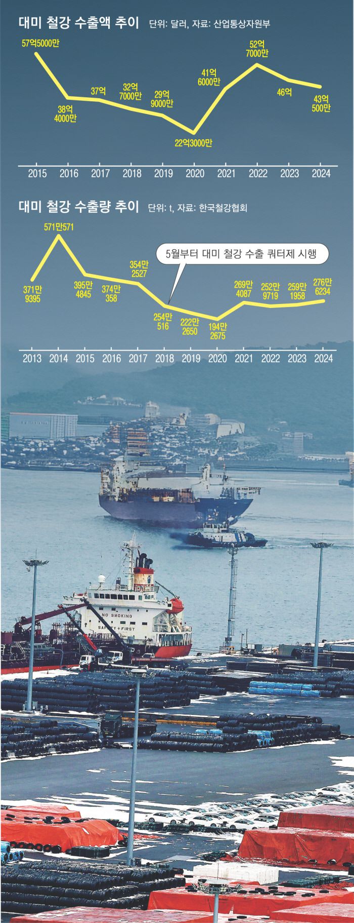 국내 철강업계는 25% 관세 부과가 기존 할당(쿼터)제에 더해 추가 규제로 작용할 것을 우려했다. 철강업계 관계자는 10일 “트럼프 대통령의 스타일을 봤을 때 할당제를 유지할 것 같지는 않다”며 “피해가 올 수 있는 만큼 정부 차원의 협상과 대응책 마련이 필요하다”고 말했다. 앞서 2018년 트럼프 1기 행정부는 무역확장법 232조를 적용해 수입 철강에 25% 관세를 부과했다. 한국은 무관세 조치를 받는 대신 대미 수출 물량을 연간 약 263만t으로 제한하는 할당제를 적용받았다.