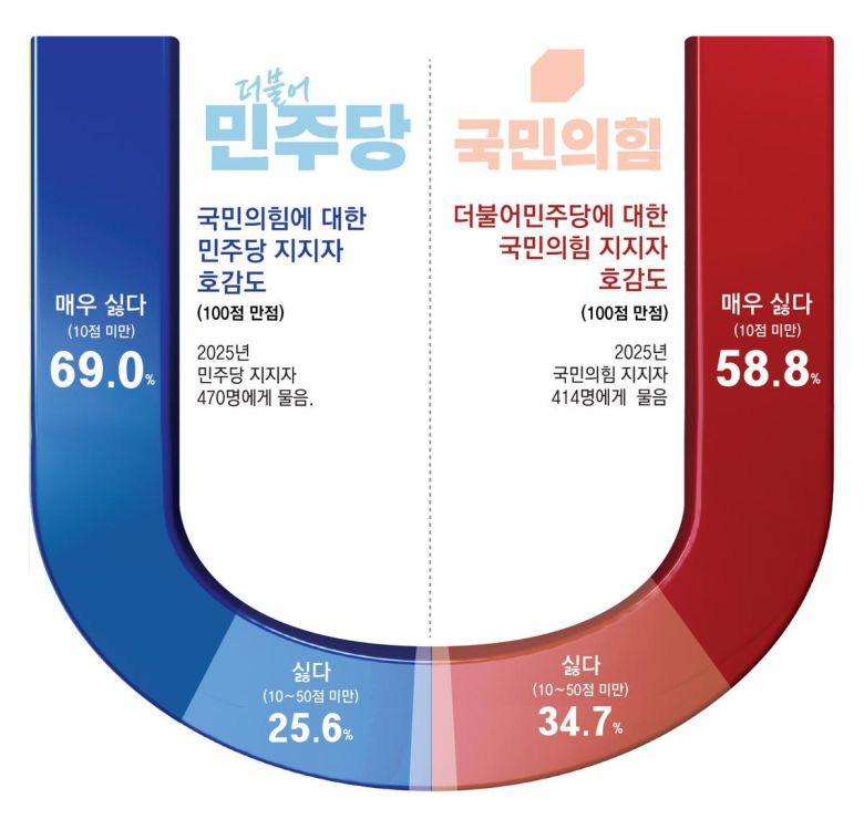 민주 지지자 69.0% “국힘 매우 싫다”… 국힘 지지자 58.8% “민주 매우 싫다”