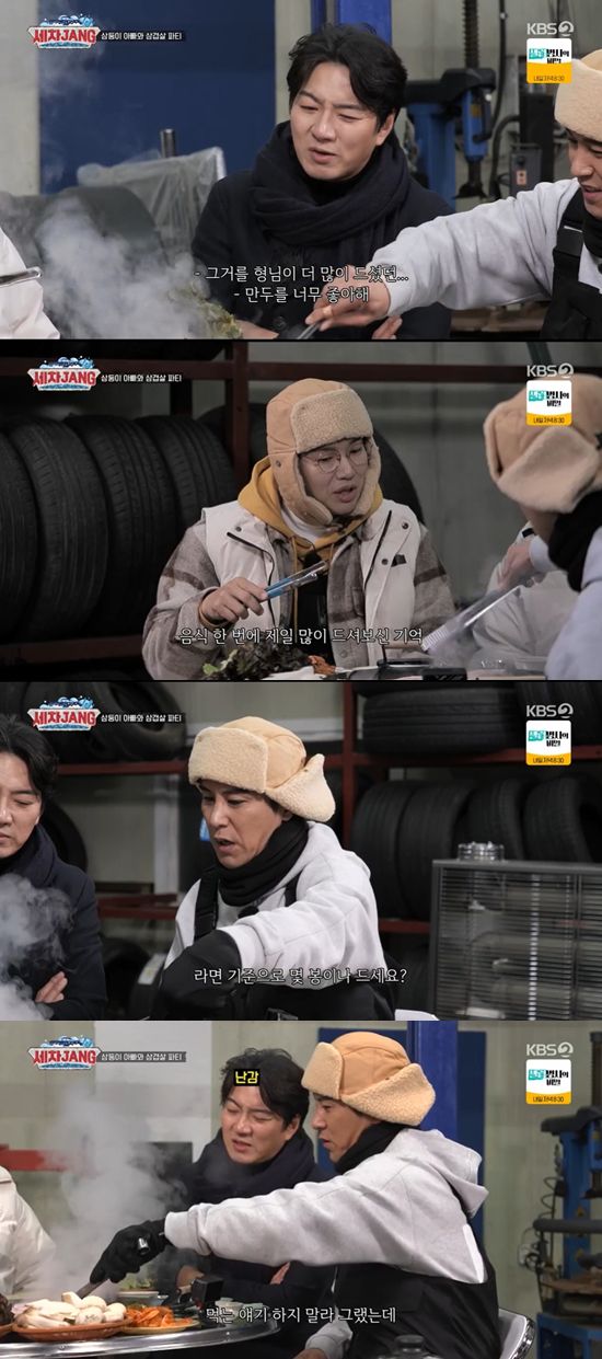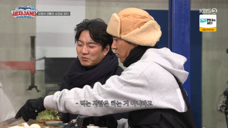 본격적으로 고기를 굽기 시작한 장성규는 "그러고보니 '슈돌'에서도 아이들보다 갈비만두를 형님이 더 많이 드셨던 게 기억난다"고 말했고, 송일국은 "만두를 좋아한다"고 말했다.