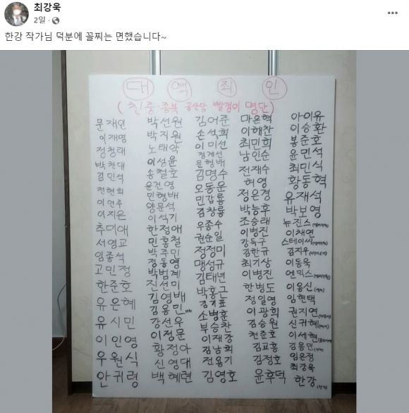 지난 9일 최강욱 전 더불어민주당은 소셜미디어(SNS) 등에 확산한 ‘빨갱이 명단’ 이미지를 자신의 페이스북에 공유하면서 “한강 작가님 덕분에 꼴찌는 면했다”고 적었다. 해당 명단에서 최 전 의원의 이름은 명단 우측 맨 아래에 적힌 한강 작가의 바로 위에 위치해 있다.