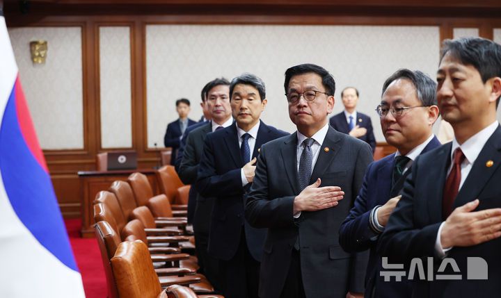 [서울=뉴시스] 최진석 기자 = 최상목 대통령 권한대행 부총리 겸 기획재정부 장관과 국무위원들이 11일 서울 종로구 정부서울청사에서 열린 국무회의에서 국기에 경례하고 있다. 2025.02.11. myjs@newsis.com