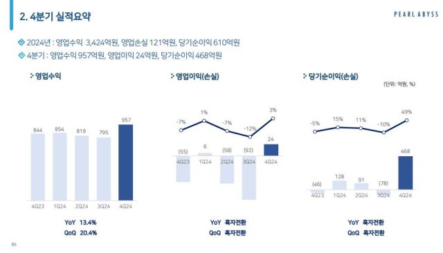 11일 펄어비스는 작년 4분기 매출 957억원, 영업이익 24억원, 당기순이익 468억원을 기록했다고 밝혔다. 매출은 전년 동기 대비 13.4% 증가, 영업이익과 당기순이익은 흑자전환했다.