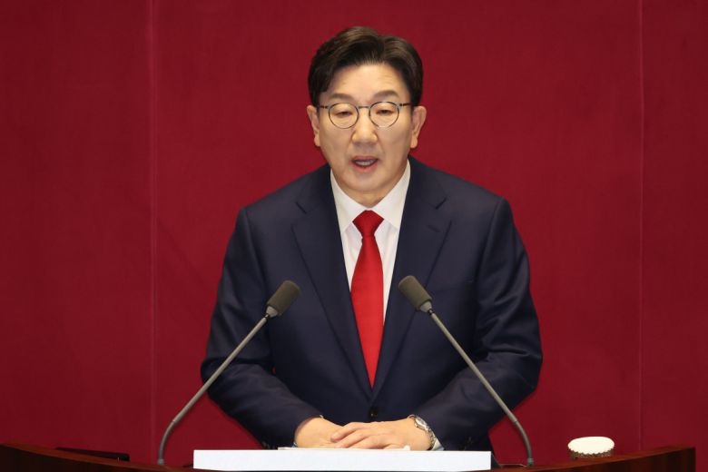 권성동 국민의힘 원내대표가 11일 오전 서울 여의도 국회에서 열린 제422회 국회(임시회) 제3차 본회의에서 교섭단체 대표연설을 하고 있다. 2025.02.11.