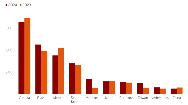 먼저 로이터통신 보도에 따르면 중국은 2023~2024년 미국 10대 철강 수입국 1위는 단연 캐나다다. 뒤이어 브라질과 멕시코ㆍ한국ㆍ베트남 순이다. 먼저 캐나다 물량이 독보적이다. 5~10위 국가의 연간 수출량을 모두 합쳐도 캐나다 1년 수출량에 한참 못 미친다.