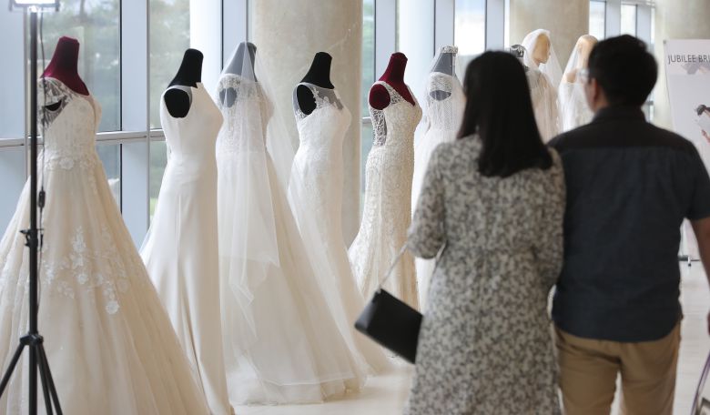 서울의 한 호텔에서 열린 웨딩 박람회를 찾은 예비 부부가 드레스 등 결혼 관련 상품을 둘러보고 있다. 기사와 관련 없음./뉴스1 |