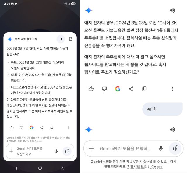 대신 "삼성전자 주주총회 일정을 알려줘"라거나, "최신 영화 개봉작이 뭐가 있어?" 등 온라인에서 찾아서 정리해야 하는 정보 제공에서 두각을 드러냈다. 여러 명령이 들어있는 문장도 척척 알아들었다. 제미나이와 대화 중 의도와 벗어난 답을 제공받을 시 "아니 아니, 그것 말고" 식으로 말 허리를 끊고 다시 지시해도 찰떡처럼 알아듣는 점이 신통방통했다.