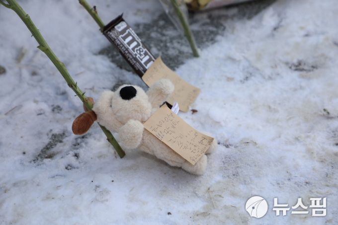 [대전=뉴스핌] 오종원 기자 = 대전 서구 한 초등학교에서 교사에게 살해당한 7세 김하늘 양을 명복을 기리는 발걸음이 이어지고 있다. 11일 오후 시민들이 김하늘 양이 다녔던 학교 앞 담벼락에 국화꽃 등을 놓아 두고 있다. 특히 어린 아이가 좋아할 만한 인형과 과자 등도 함께 놓이며 안타까움을 전했다. 또래 학생이 쓴 것으로 보이는 '하늘아 많이 아팠지, 천국가서 편히 쉬어, 우리가 널 아끼고 있을게' 라는 글이 눈물을 자아 낸다. jongwon3454@newspim.com