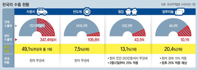 미국으로 수출하는 한국산 철강 제품의 ‘관세 폭탄’이 현실이 되며 국내 철강 업계를 비롯해 자동차와 반도체 업계 등에도 일제히 비상이 걸렸다. 미국 도널드 트럼프 대통령이 “관세 부과에 예외는 없다”며 철강의 다음 표적으로 자동차·반도체·의약품 등을 콕 집어 거론해서다. 반도체와 자동차는 한국 수출의 3분의 1가량을 차지하는 수출 1·2위 품목이다. 당장 관세 폭탄을 피할 수 있는 미국 현지 생산을 늘리기엔 현실적인 제약이 큰 터라, 주력 수출 기업들이 수익에 직격탄을 맞을 수 있다는 우려가 나온다.