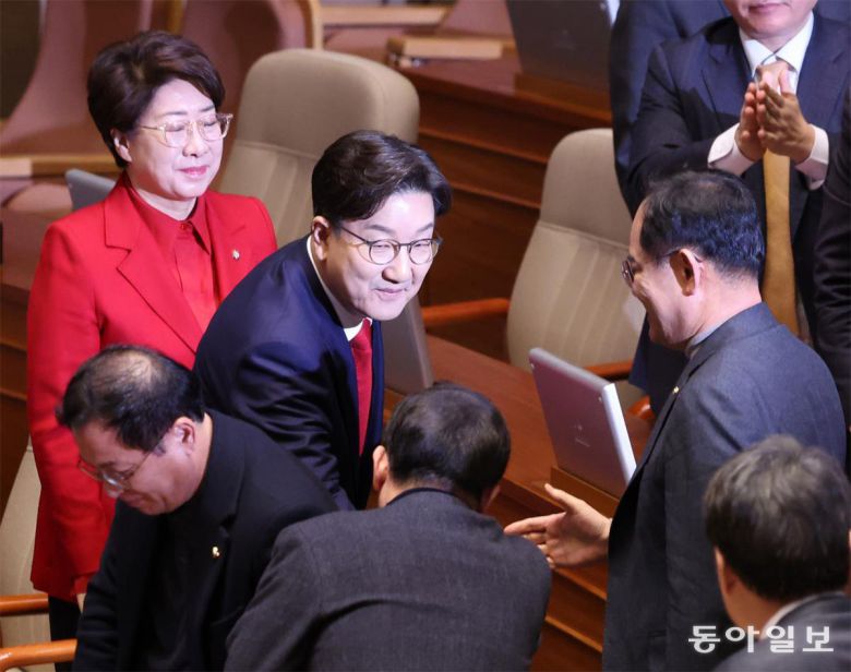 연설 마친 권성동 국민의힘 권성동 원내대표가 11일 국회 본회의에서 교섭단체 대표 연설을 마친 뒤 국민의힘 의원들과 악수하고 있다. 권 원내대표는 연설에서 “헌정질서 파괴자는 바로 더불어민주당 이재명 세력”이라고 주장했다. 장승윤 기자 tomato99@donga.com