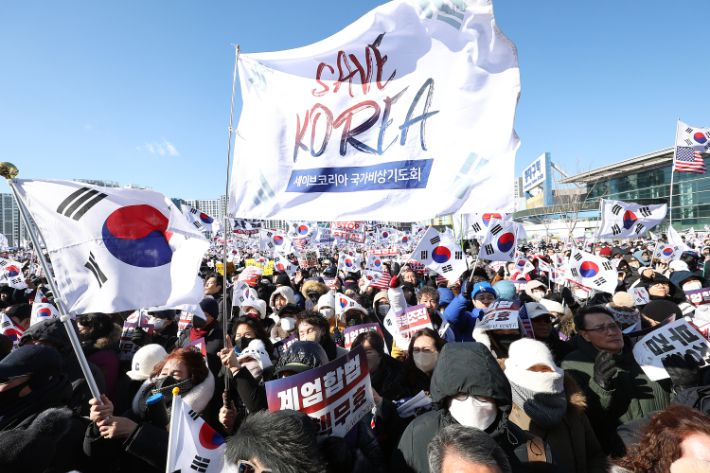 지난 8일 동대구역 광장에서 개신교 단체 세이브코리아가 국가비상기도회를 열고 윤석열 대통령 탄핵 반대와 석방을 촉구하는 모습. 연합뉴스 |