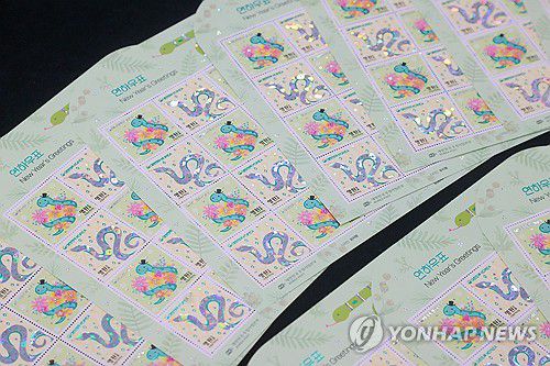 2025 을사년 우체국 연하우표(서울=연합뉴스) 류효림 기자 = 2일 서울 중구 서울중앙우체국 우표박물관에서 우정사업본부 직원들이 '2025 을사년' 연하우표·카드를 소개하고 있다. 우정사업본부는 '2025 을사년' 푸른 뱀의 해를 맞아 연하우표와 연하카드·엽서 14종을 발행했다. 2024.12.2 ryousanta@yna.co.kr